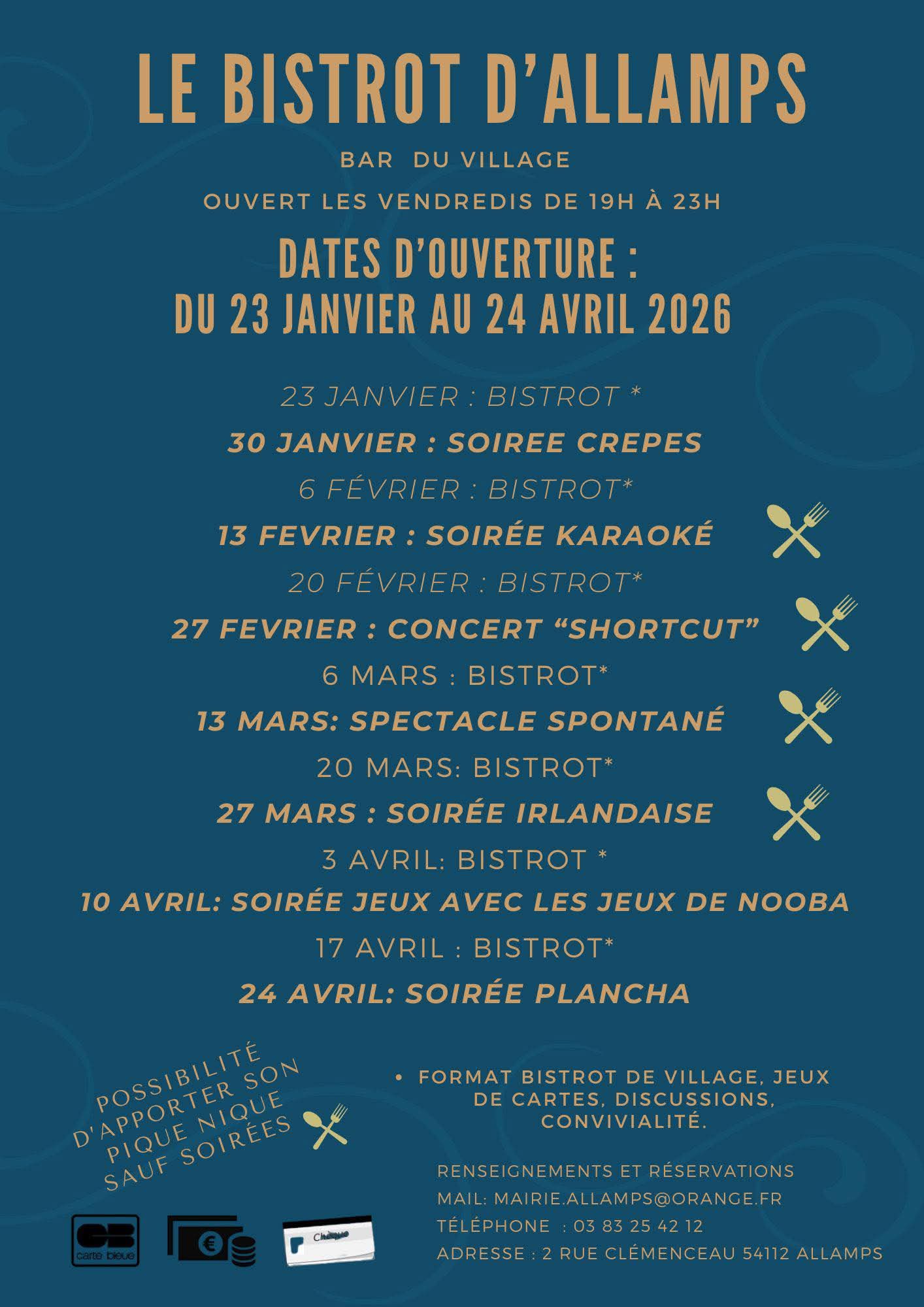 Le BISTROT du village est ouvert tous les vendredis* soir de 19h à 23h.
